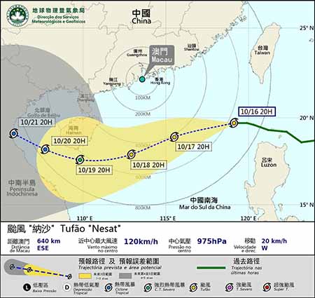 氣象局於昨日(十六日)下午二時發出一號風球,位於南海北部的「納沙」已於下午增強為颱風,未來一兩日向偏西方向移動,隨後逐漸轉向西南方向橫過南海北部,在澳門以南約四百五十公里範圍內掠過。