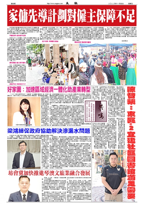 “二十大”報告為澳門特色的“一國兩制”成功實踐行穩致遠,進一步指明清晰方向,同時中央將全力支持港澳深度參與大灣區建設、鞏固國際競爭優勢。共建好家園協會副理事長林毓霞表示,粵港澳大灣區的區域經濟將成為澳門經濟轉型的重要引擎,為加快澳門經濟適度多元化的進程帶來全新機遇。她建議政府分階段推進現代金融業發展,多向社會大眾推廣灣區最新動向,帶動居民積極融入國家發展大局。