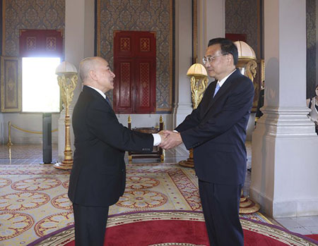 【中新社金邊11月11日電】(記者 黃鈺欽)當地時間11月11日上午,中國國務院總理李克強在金邊王宮會見柬埔寨國王西哈莫尼。