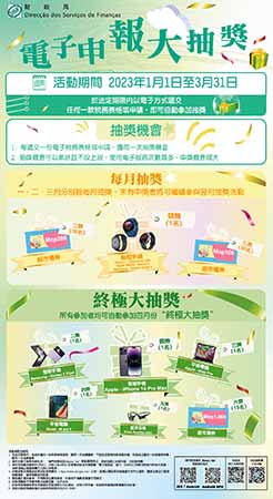 【特訊】財政局表示,因應第一季報稅高峰期,為鼓勵納稅人利用手機及或網上報稅,財政局特別推出電子申報抽奬活動,凡在2023年1月1日至3月31日期間透過電子方式進行報稅或遞交稅務申請者,即可自動參加抽奬。