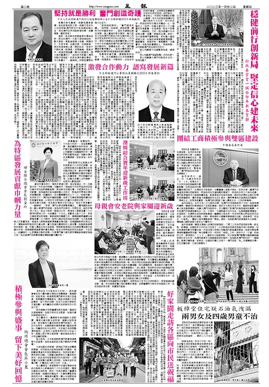 崔世昌指出,去年中共二十大勝利召開,為澳門未來發展指明了方向,為發揮澳門優勢、構建利好環境提供了空間和機遇。習近平主席在中共中央、國務院春節團拜會上發表重要講話,向廣大澳門同胞拜年,充分體現了對澳門的高度重視和關懷。今年是澳門中華總商會成立一百一十周年,中總將謹守百年宗旨,弘揚愛國愛澳傳統。在這階段,中總將全面加快開展會務,繼續與工商各界一同支持和配合特區政府依法施政,助力經濟加快復甦。同時,將發揮好中總廣東辦事處的功能,助推業界「走出去、引進來」,團結工商界積極參與「雙區」建設,為推動澳門經濟適度多元發展、積極融入國家發展大局作出不懈努力。