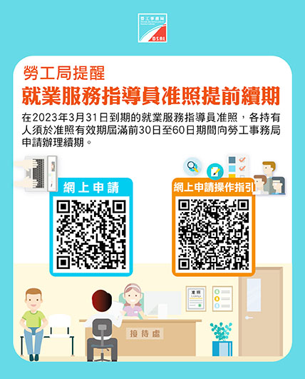【特訊】勞工事務局表示,按照第16/2020號法律《職業介紹所業務法》規定,在2023年3月31日到期的就業服務指導員准照,各持有人須於准照有效期屆滿前30日至60日期間向勞工事務局申請辦理續期。倘少於30日前提出,須額外繳付多1倍續期費用;另倘有效期屆滿前仍未提出,准照會被註銷。因此,准照持有人務必於法定期間內提出續期申請及提交所需的申請文件。辦理續期可透過掃瞄二維碼於網上申請或以紙本方式提交。