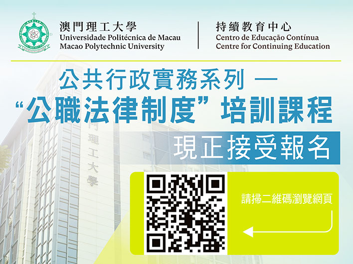 【特訊】為回應社會需要,澳門理工大學持續教育中心開辦「公職法律制度」課程,由具有多年公職領導工作經驗的資深導師講授,內容涵蓋公共行政的概念及體系、公職法律制度的概念、職程制度、公共行政人員通則、評核制度和領導及主管人員通則,理論與實務並重,適合在職公職人員進修和有意投身公職工作的人士修讀。課程現已接受報名,報名日期至2023年3月24日,額滿即止。
