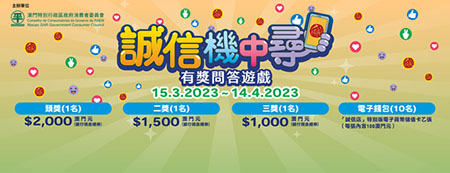 消委會持續提升“誠信店”質素,監督“誠信店”為消費者提供更周全的保障、更優質的服務,助力提升消費者的信心,達到促消費的效應。消委會推廣及加強“誠信店”是消費信心的保證,舉辦“誠信”機中尋有獎問答遊戲,遊戲由2023年3月15日開始至4月14日結束。