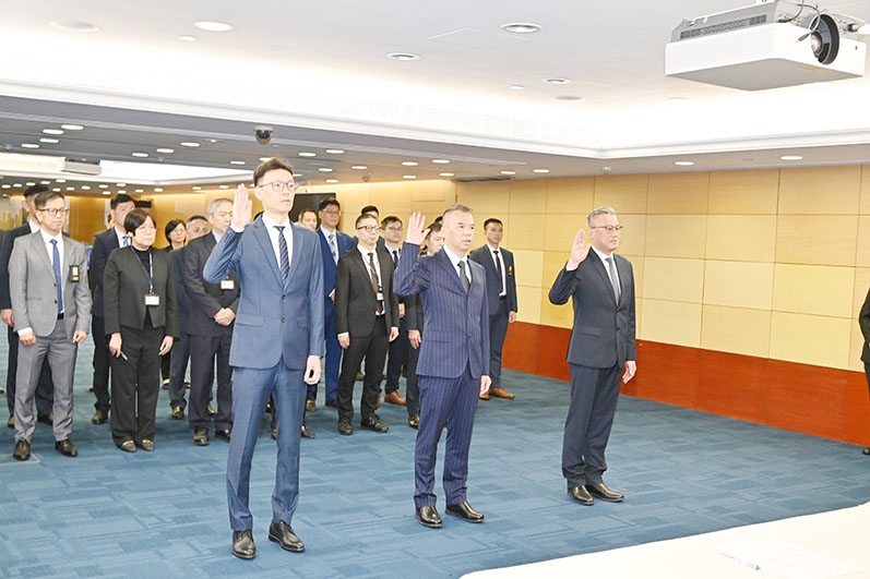 【特訊】司法警察局於3月22日在總部大樓舉行主管就職儀式,在局長薛仲明監誓,並在兩位副局長賴文威、蘇兆強及代副局長岑錦榮,以及各部門主管的見證下,恐怖主義罪案預警及調查處處長黎尚文、博彩罪案調查處處長鄧錦華、有組織罪案調查處處長陳仲賢分別宣誓就職。