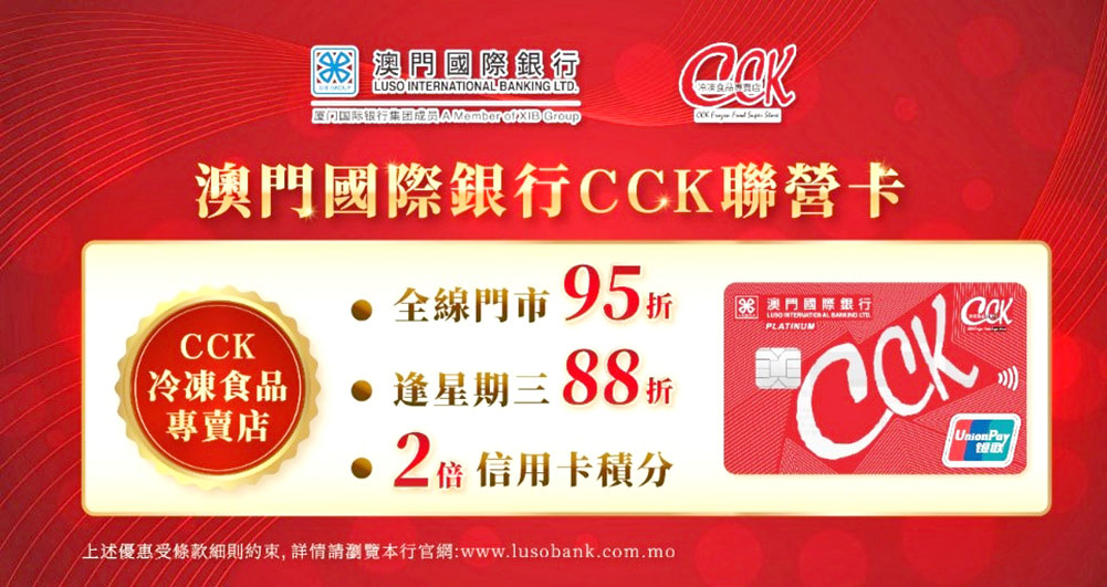 “澳門國際銀行CCK聯營信用卡”是澳門國際銀行與澳門老字號品牌CCK加強合作,聯合推出的信用卡産品,爲持卡客戶打造了專屬福利,以期共同爲客戶提供更優質的消費體驗。持該聯營卡於CCK冷凍食品專門店消費,全年享有95折優惠,逢星期三享有88折優惠;於CCK簽賬享2倍積分,其他簽賬享1.5倍積分。