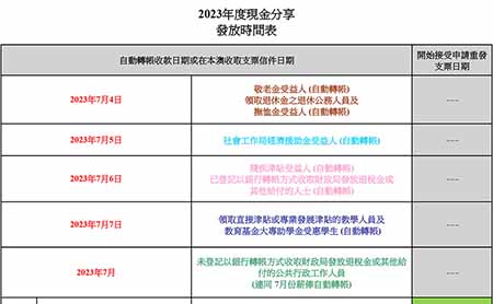 【特訊】二零二三年現金分享計劃將於七月四日起分批發放,發放規則與去年相同,每名永久性居民可獲發一萬元,非永久性居民則獲發六千元,涉及總預算開支為七十二億九千萬元。財政局強調,現金分享計劃僅屬臨時性措施。