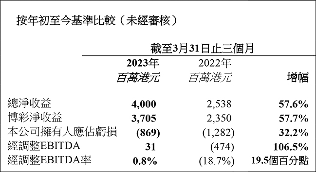 ‧本集團於2023年第一季度之博彩淨收益1增加至37.05億港元,於2022年第一季度則為 23.50億港元。