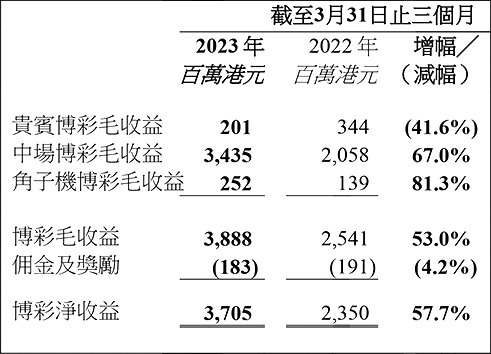 本集團之貴賓博彩毛收益於2023年第一季度為2.01億港元,較2022年第一季度之3.44億港元減少41.6%;中場博彩毛收益為34.35億港元,較去年同期之20.58億港元增加67.0%;角子機博彩毛收益為2.52億港元,較去年同期之1.39億港元增加81.3%。