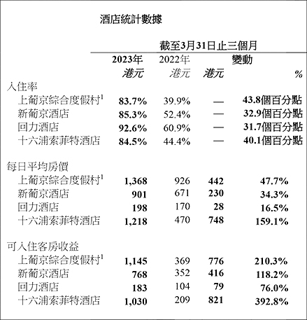 本集團於2023年第一季度之總淨收益為40.00億港元,其中包括酒店、餐飲、零售、租賃及相關服務收益2.95億港元(2022年第一季度為1.88億港元)。