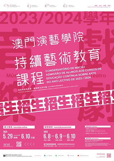 有意報讀2023至2024學年各項音樂及戲劇持續藝術教育課程的人士,可於5月29日至6月10日期間登入網頁www5.icm.gov.mo/consreg進行網上報名,或於6月8日至10日指定時間親臨高士德大馬路14至16號澳門演藝學院報名。課程詳情可於辦公時間內致電2835 2766(音樂學校望德堂校舍)、2857 1207(音樂學校高士德校舍),2870 1588(戲劇學校)或瀏覽澳門演藝學院網頁www.cons.gov.mo。