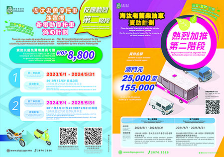 經綜合考慮成效和社會意見,特區政府自2023年6月起推出第二階段《淘汰老舊摩托車並置換新電動摩托車資助計劃》及《淘汰老舊柴油車資助計劃》並擴大資助對象範圍。預計將可進一步淘汰一批較高污染的老舊電單車及柴油車,助力儘快實現“雙碳”目標。