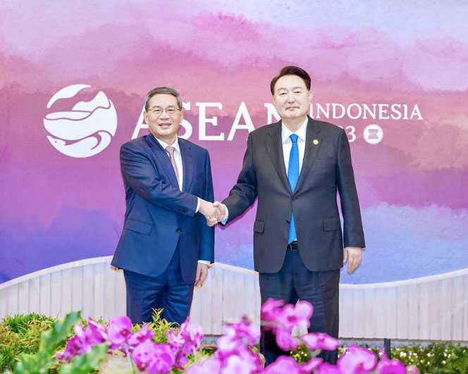 李強表示,去年二十國集團巴厘島峰會期間,習近平主席同總統先生就中韓關係深入交換意見。中方願同韓方一道,落實好兩國元首重要共識,秉持建交初心,增進政 治互信,排除干擾,相向而行,推動中韓關係與時俱進發展,更好造福兩國人民,促進本地區和平穩定與發展繁榮。