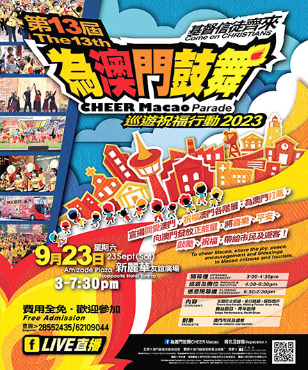 【特訊】為了持續第十三年發揮「為澳門鼓舞」五大目的,「同心同行」、「傳遞關愛」、「宣揚正能量」、「實踐服侍」及「助長社會積極發展」, 由澳門基督徒音樂協會主辦,文化局合辦,二十多間澳門基督教教會及機構籌辦,市政署協辦,文化發展基金為支持單位之「為澳門鼓舞」巡遊祝福行動將於2023年9月23日(本周六)假澳門新麗華友誼廣場舉行。