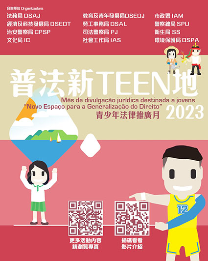 想了解更多各項活動的詳情,請掃瞄海報中的二維碼,瀏覽2023「普法新TEEN地」青少年法律推廣月專題網頁,以及請留意各合辦部門公佈的活動資訊。