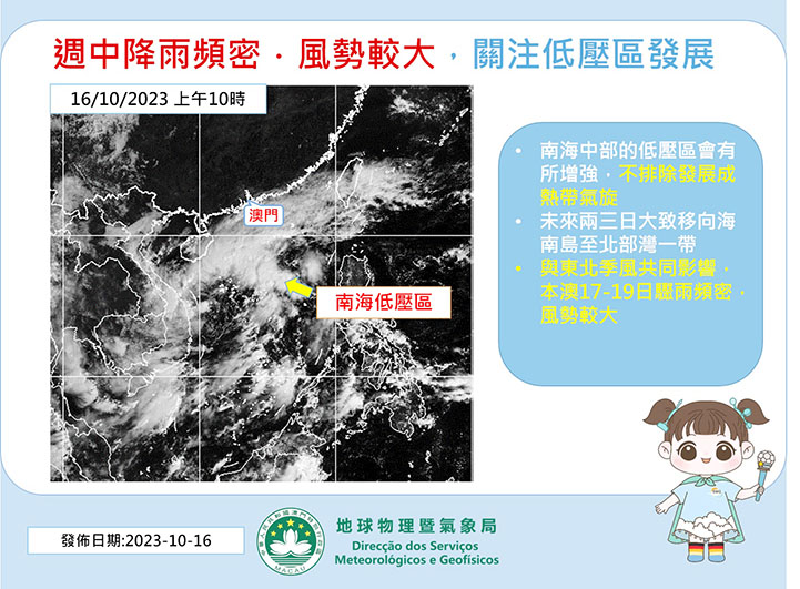 氣象局表示,近日天氣秋高氣爽,但南海中部仍處夏季狀態,現時該區又再有低壓區正在發展,並可能自今日(十七日)開始影響本澳天氣,屆時降雨將逐漸變得頻密、風勢亦會較大。按現時的預測資料顯示,南海的低壓區將有所增強,不排除發展成為熱帶氣旋,但預料強度發展一般,未來兩三日大致趨向海南島至北部灣一帶。