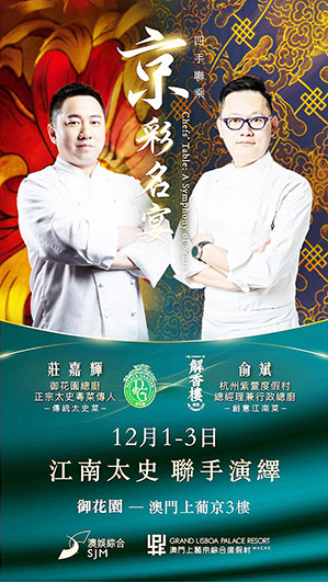 「御花園」總廚莊嘉輝是太史菜傳人的入室弟子,以「精益求精」的烹飪精神為經典太史菜式及精緻粵菜佳餚注入創新靈魂。本次「『京』彩名宴」,他將與來自「杭州紫萱度假村」的總經理兼行政總廚俞斌合作。紫萱旗下的「解香樓」兼具米芝蓮一星及黑珍珠二鑽殊榮,以精美江南菜餚著稱。二人共同設計四手聯乘珍饈菜單,囊括八道佳餚,包括太史黃魚燕窩粥、海膽白蝦蘇幫麵等,每位澳門元 3,388+,或每位澳門元 4,688+,尊享三款美酒搭配,盡享完美盛宴。