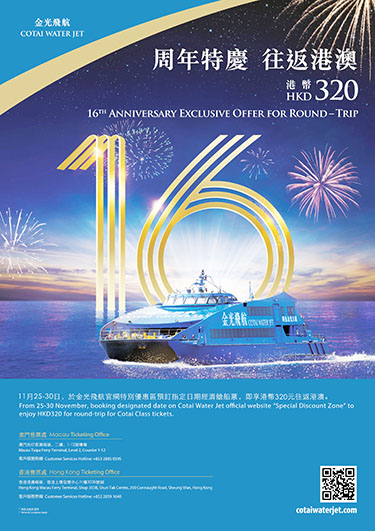 於2023年11月25至30日期間,賓客透過金光飛航官方網站(https://hk.cotaiwaterjet.com/ )特別優惠專區,即可以港幣320元(已含稅)享受澳門氹仔客運碼頭往/返香港港澳碼頭(「市區航線」)標準艙套票優惠,船票出發日期為2023年12月1至19日。數量有限,先到先得。更多相關詳情,請瀏覽https://hk.cotaiwaterjet.com/ferry-promotion/CWJ16Anniversary.html