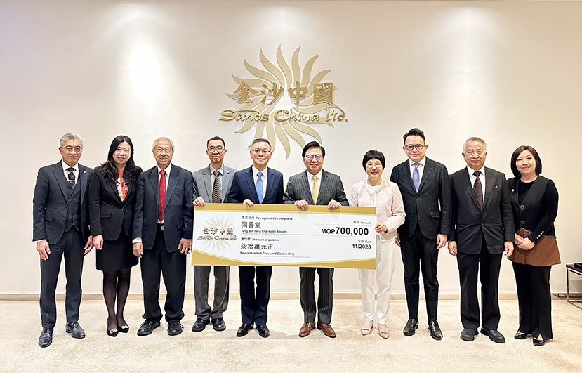 支票捐贈儀式於11月23日在澳門威尼斯人®舉行,金沙中國有限公司總裁王英偉博士、人力資源副總裁李嘉寶、企業傳訊及社會事務副總裁沈頌年及社會事務總監林妤庭代表公司向同善堂贈予支票,由同善堂值理會主席崔世平、值理會副主席馬有友、值理霍麗斯、李子豐、李傑興及蔡明威代表接收。