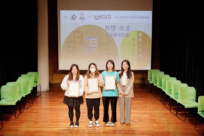 【特訊】由澳門特殊奧運會及本地藝團四維空間合辦之『共想‧共活』社區藝術計劃年度呈現,劇目《日日復日日》已於2023年12月19日下午三時假澳門演藝學院禮堂順利完成。出席嘉賓包括文化產業基金資助管理處處長歐陽凱明、文化局文娛活動處代表周佩雯、教育及青年發展局教育資源中心中心主任蘇智敏、社工局高級技術員黎嘉明、澳門明愛副服務總監李浩旋、澳門扶康會項目經理周惠萍、草莓田藝術工作室理事長林蘊華、澳門紐曼樞機藝文館館長黃啟堯、澳門教區生命委員會辦事處助理主任黃偉鴻及澳門利民會寬樂身心健康服務中心陳凱盈,並由澳門特殊奧運會執行總監蕭宇康及四維空間代表古英元導演頒發紀念品予出席活動嘉賓。而為了嘉許完成培訓及實踐活動的義工,文化發展基金歐陽處長亦代表頒發感謝狀予完成了培訓及實習的義工,以嘉許其付出,義工分別為梁敏琪、黃笑萍、及何詠珊。