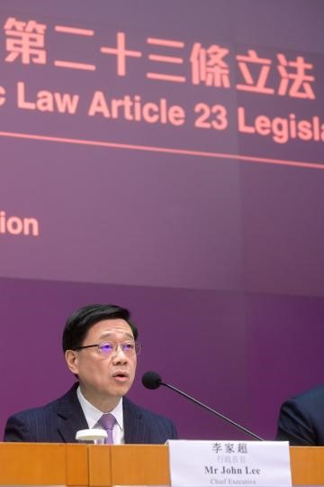 李家超表示,香港基本法第二十三條立法是特區的憲制責任,要必須做、盡快做。他介紹,此次立法建議採取三個原則:第一,“一國兩制”方針的最高原則是維護國家主權、安全、發展利益;第二,尊重和保障人權,依法保護根據香港基本法、《公民權利和政治權利國際公約》和《經濟、社會與文化權利的國際公約》適用於香港特區的有關規定享有的包括言論、新聞、出版、結社、集會、遊行、示威的自由在內的權利和自由;第三,對於危害國家安全的行為和活動應當按法治原則堅持積極預防和依法懲治。