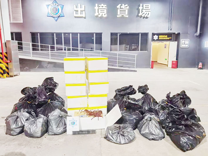 二十日晚上,澳門海關於橫琴口岸透過風險管理系統的預警佈控截查一出境粵澳兩地牌車輛,關員目視檢查發現車輛的副駕駛座及後座藏有大批可疑物品,其後使用「大型X光貨物及車輛檢查系統」作進一步查驗,機檢圖像顯示車尾廂內亦藏有相關可疑物品。經關員對該車輛作徹底檢查,合共檢獲活龍蝦三百八十六隻(約重三百七十公斤),全數不具備有效的申報文件。