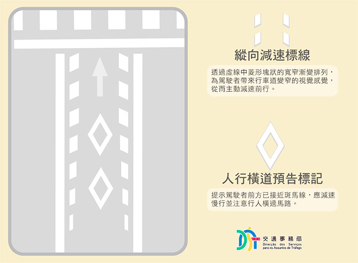 而“人行橫道預告標記”則為行車道上的白色菱形圖案,一般設於斑馬線前30至50米,旨在提示駕駛者前方已接近斑馬線,應減速慢行並注意行人橫過馬路。