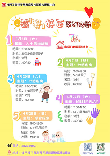 【特訊】澳門工聯筷子基家庭及社區綜合服務中心謹訂於4月舉辦感「覺」好正系列活動,系列活動以感覺統合(七感)為主題,對象適合6個月至6歲的親子,日期分別是4月6、7、20、27及28日,透過活動刺激幼兒感統及大腦發展,提升自信心及親子關係。詳情可查閱活動海報。