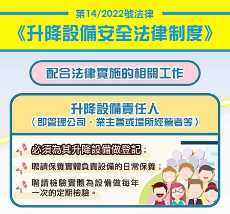 【特訊】第14/2022號法律《升降設備安全法律制度》及相關配套法規昨日(4月1日)起正式生效實施,透過制度化及規範化管理,明確保檢分家,令升降設備的使用更有安全保障。為配合法律實施,已投入運作的升降設備須於本年三月底前向土地工務局登記,以便按新要求做好保養和檢驗工作。