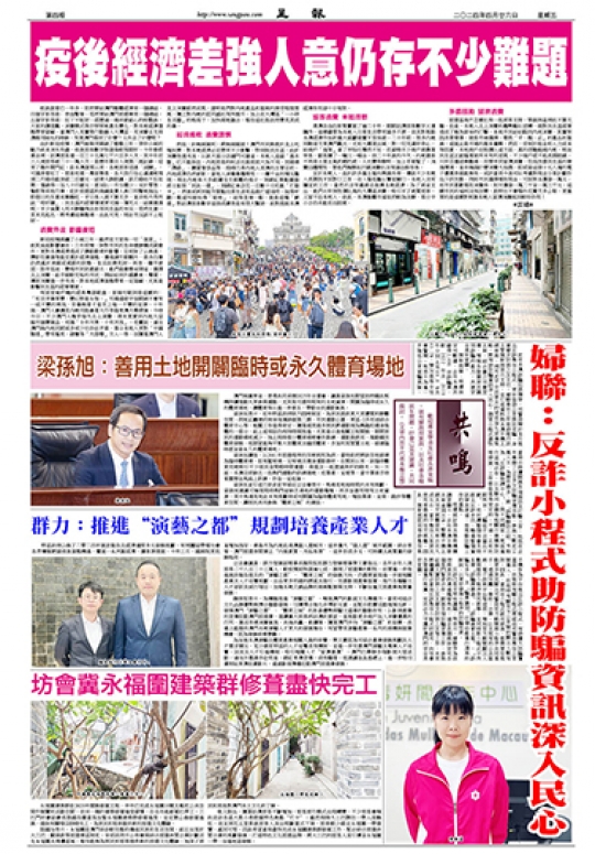 梁孫旭續指,以2011年旅遊塔旁的空地利用為例,當時政府將該空地修建為臨時體育場,設有籃球場、足球場及健身運動器材。自開放以來,該臨時體育用地吸引不少居民在閑暇時間運動,與朋友一起渡過美好的時光。另一方面,本澳目前缺乏一些熱門運動的訓練場地,如單車、足球等,當中單車手時常需要在馬路上訓練,存在一定危險。