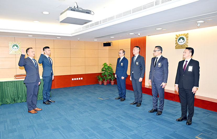 【特訊】司法警察局於2024年5月16日在總部大樓舉行主管就職儀式,在薛仲明局長監誓,並在賴文威、蘇兆強、岑錦榮三位副局長及各部門主管的見證下,賴釗洪二等督察宣誓就任保安廳廳長、劉永權副督察宣誓就任特別調查處處長。