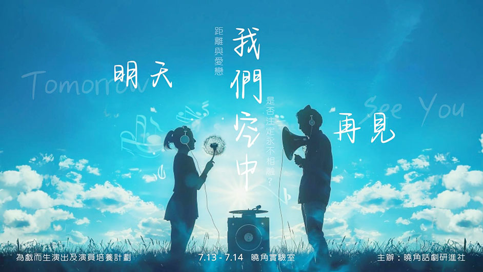 《我們明天空中再見》時長約90分鐘,不設劃位,未滿13歲不宜觀看,費用全免。有興趣人士可於(https://form.jotform.com/241794134125454)報名。詳情可瀏覽“曉角話劇研進社”Facebook,查詢可電郵hiubook@gmail.com。