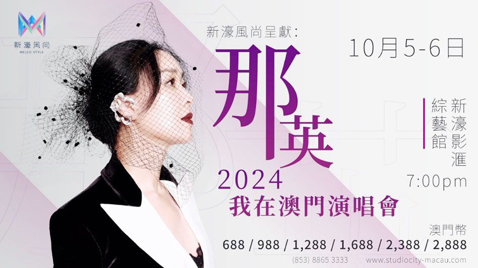 新濠風尚呈獻《那英2024我在澳門演唱會》將於10月5日隆重登場,門票即將於8月19日公開發售。成為「新濠風尚」微信會員可於8月12至18日以8折優惠優先預訂門票,4人同行享75折優惠,同時更可專享VIP貴賓包廂派對套票,於包廂觀賞演唱會同時享用精緻美食。購票及相關詳情,敬請瀏覽:https://www.studiocity-macau.com/tc/offer/melco-style-naying-concert