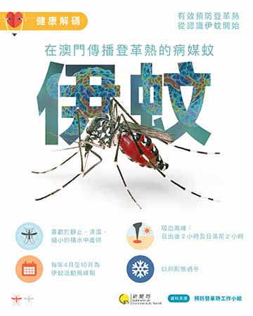 由於澳門近期降雨較多,令室外容器容易積水,有利蚊蟲孳生,加上目前正處於登革熱傳播的高風險季節,各地登革熱疫情亦較為嚴重,衛生局會密切留意東南亞和鄰近地區的登革熱疫情,並作好準備應對疫情變化。衛生局再次向居民、外僱及旅客等作出以下呼籲:1.注意環境衛生,清除工作地點和家居周圍環境的積水,杜絕蚊蟲孳生;2.在家中使用紗窗、蚊帳或開冷氣等措施,減少被蚊叮咬機會;3.若前往登革熱流行地區,宜穿淺色長袖衫褲,在有空調或防蚊裝置的地方住宿,外出時使用驅蚊劑,防止被蚊叮咬;4.不論是否有外遊史,若有發熱、出疹等疑似登革熱症狀,應及時就醫,並告知醫生有關的居住地點或旅遊史;5.醫生應對疑似登革熱病人及時作出檢測和申報,衛生局的公共衛生化驗所為所有醫療機構提供免費的登革熱檢測服務。6.若有疑問可致電衛生局傳染病熱線28700800或瀏覽傳染病網頁http://www.ssm.gov.mo/csr。