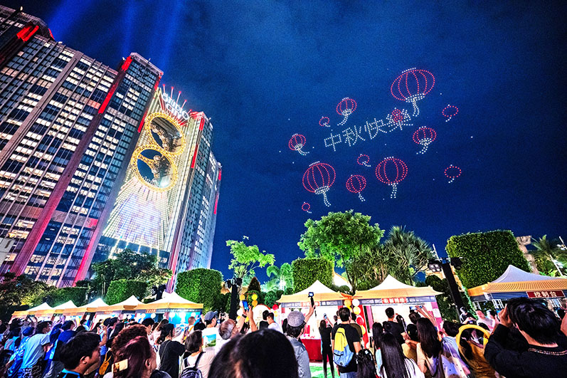 【特訊】新濠影滙首次千架無人機翱翔匯演及中秋燈會活動「穿月Drone秋夜」週六(14日)揭開序幕,為賓客帶來精彩的夜間娛樂體驗。逾千名賓客相聚閃爍矚目的8字形摩天輪下觀賞1000架無人機在璀璨的夜空中交織出新穎的中秋題材的故事及無限創意的圖案。