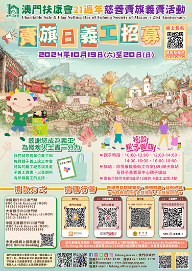 今年一年一度的慈善賣旗義賣日將於10月19及20日(六、日)在澳門和氹仔各街道及地區進行,屆時需要大量義工參與及支持,期望社會各界人士能踴躍參與義工行列,共襄善舉。今年除了一般賣旗外,亦設有親子賣旗。本會歡迎父母們陪同年齡3歲以上的小義工出席活動,以身作則積極參與公益活動,從小培養他們的善心及同理心,將慈善融入教育,宣揚正面、正確的態度予下一代。