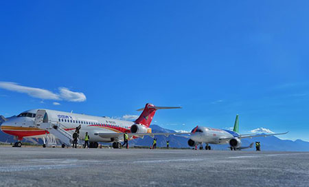C919飛機與正在進行演示飛行的國產支線客機ARJ21相聚在青藏高原。自今年8月21日開始,ARJ21飛機以四川成都、青海西寧和西藏拉薩為運行基地,開展“環青藏高原”演示飛行。截至目前,已完成25條航線,55個航段,62小時的飛行任務,覆蓋11座高高原機場,並4次執飛世界海拔最高民用機場——稻城亞丁機場,充分驗證了ARJ21飛機高高原運行的適應性。