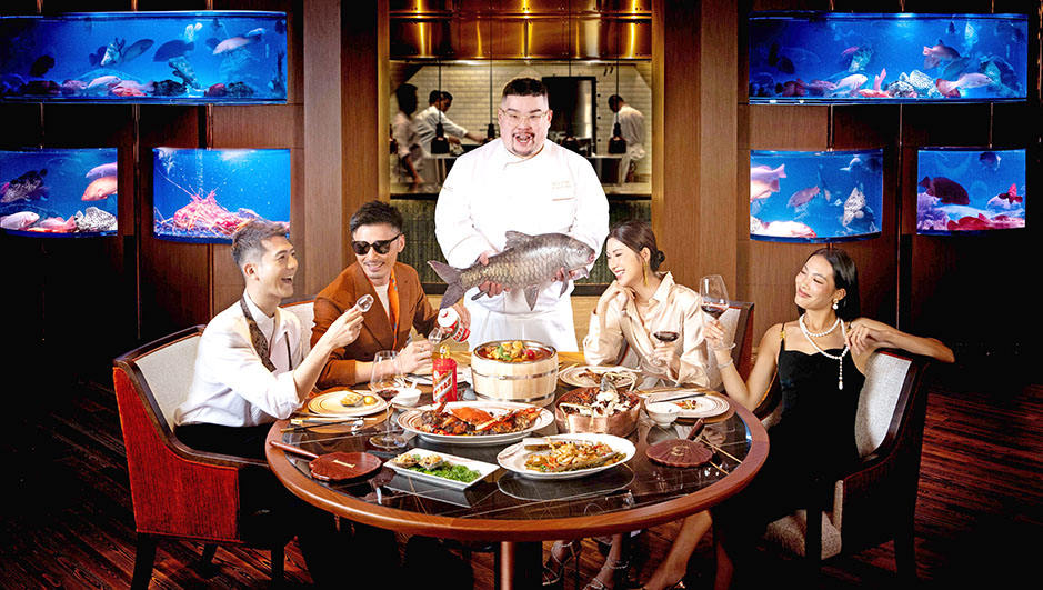 珍饈佳釀競拍 美味誰與爭鋒 ;「九鯤」還創新推出了別開生面的「珍饈佳釀拍賣盛會」。每逢週五及週六夜幕降臨之際,水與 火交織的絢爛表演湖上演,拍賣會隨之正式拉開序幕,點燃整個夜晚的活力與激情。賓客不僅可 享受饕餮盛宴,還將參與及見證一場場圍繞珍饈佳釀展開的的激烈競拍。從稀有海鮮到極具收藏 價值的茅台美酒,每一件拍品都將喚醒賓客的挑戰精神,引發場內此起彼伏的熱烈競價。拍賣槌 落下的瞬間,得標者不僅獲得滿堂喝彩,還將由張總廚依照他們的喜好,精心烹調所得標的海鮮 珍品,為賓客帶來難以忘懷的體驗。 「九鯤」不僅是一間餐廳,更是一座充滿活力與戲劇張力的美食勝地。無論是茅台愛好者、海鮮 饕客,還是追求新鮮體驗的食客,都能在這裡找到屬於自己的高光時刻,體驗無與倫比的美食饗 宴。 傳媒照片: 「九鯤」由行政總廚張志成呈獻環球海鮮盛。