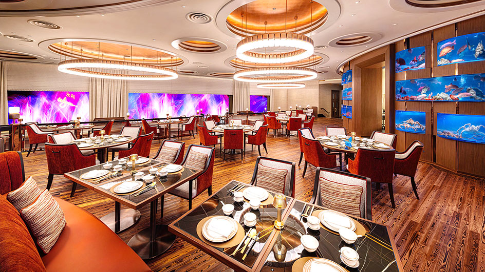 由備受矚目的行政總廚張志成主理,「九鯤」匯聚全球頂級海鮮與琳瑯滿目的佳釀,巧妙融合各 地烹調技法,並大膽將茅台融入菜餚,開創出令人驚豔的嚐鮮新體驗。餐廳首創珍饈佳釀的現場 競拍,讓饕客在熱鬧非凡的氛圍中醇飲鮮饗,猶如美食鑑賞家般沉浸於這場無與倫比的感官盛宴。 餐廳採用現代設計風格,配備多個純手工打造的曲面藝術魚缸,和以綠松石色為基調的茅台酒吧 交相輝映,宛如身處夢幻的海底世界。賓客還可 180 度飽覽永利標誌性的表演湖,欣賞迷人的水 舞表演,享受視覺與味覺的雙重饗宴。