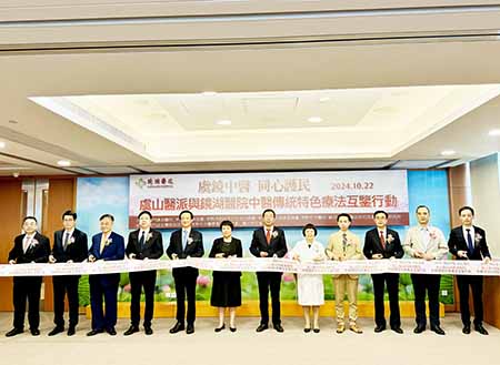 「虞鏡中醫 同心護民—虞山醫派與鏡湖醫院中醫傳統特色療法互鑒行動」開幕禮昨午在鏡湖醫院霍英東專科大樓荷花廳舉行,衛生局局長代表、世界衛生組織傳統醫藥合作中心(澳門)主任莫蕙;澳區全國人大代表劉藝良;鏡湖醫院慈善會副理事長、秘書長兼醫院院長吳培娟;藥物監督管理局中藥處處長林富聰;澳門江蘇聯誼會創會會長岑展平;鏡湖醫院慈善會常務理事黃嘉豪;鏡湖醫院慈善會理事白琪文;常熟市委統戰部常務副部長吳文進;常熟市衛生健康委員會黨組書記、主任黃熙枚;常熟市中醫院黨委書記、常熟市中醫學會會長葉文華;常熟市對外文化交流促進會辦公室主任張俊華等出席剪綵儀式。同場,澳、蘇中醫業界共同為「中醫藥文化建設促進聯盟」揭牌。