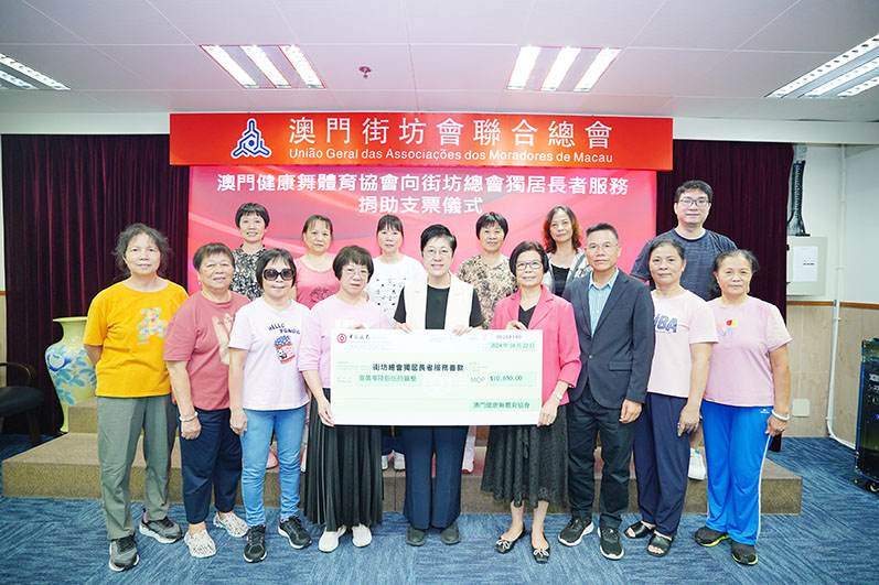 澳門健康舞體育協會及澳門無極健身球體育協會為支持澳門街坊會聯合總會「2024年為獨居老人服務賣旗籌款」活動,於今月動員發起募捐行動,感謝多位會員的支持下,澳門健康舞體育協會籌得一萬零六百五十元,由陳少佳理事長,陳淑珍、黃常英及盧美聯副理事長,黃鳳嬌監事長等代表致送善款支票。澳門無極健身球體育協會籌得二千七百元,由吳銳紅理事長、陳連英副理事及李民秘書長代表致送善款支票。於本月22日將善款呈交予街坊總會,由街坊總會吳小麗會長、副會長周宜心及莫偉成秘書長代表接受。