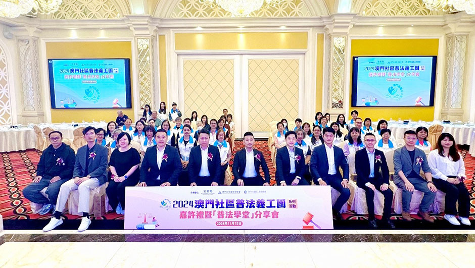 【特訊】由法務局、澳門街坊會聯合總會及澳門社區義工聯合總會合辦的2024「澳門社區普法義工團」系列活動嘉許禮暨「普法學堂」分享會日前完滿舉行,邀請到中聯辦社工部三級調研員胡碩、法務局法律推廣及公共關係廳廳長陳志揚、處長馬理章、街坊總會副理事長兼立法議員顏奕恆、社區義工總會理事長鄧文基、「普法學堂」課程導師黃景禧、導師林美芳、系列活動統籌梁潔環及一眾支持普法活動之義工團體代表出席。