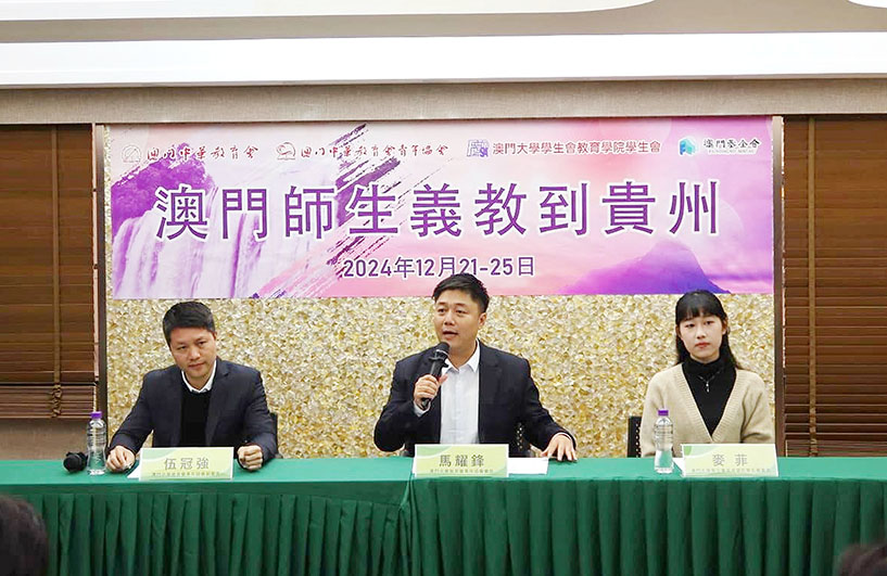澳門中華教育會青年協會和澳門大學學生會教育學院學生會合辦「澳門師生義教到貴州」活動,主辦單位昨日下午在教育會會址舉行記者招待會,教育會青年協會會長馬耀鋒、副會長伍冠強,澳大教育學院學生會會長麥菲介紹活動詳情。