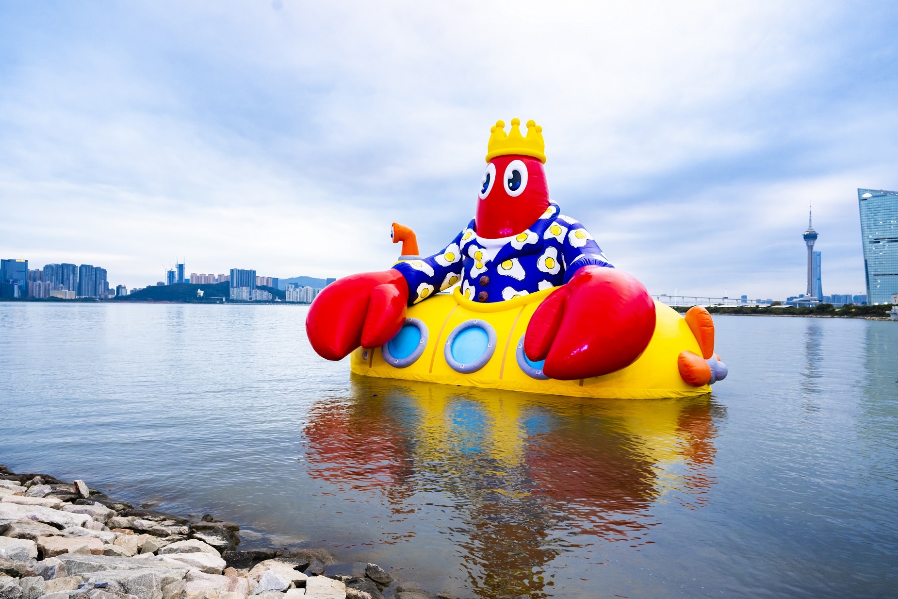 由即日起至3月16日期間,澳門科學館對出海面設置15米高的《龍蝦國王海上遊》巨型藝術充氣裝置,沿岸區域亦同步展出藝術家四件主題藝術雕塑,讓觀眾聚焦澳門海岸線,欣賞城市沿海的獨特美景。此外,高達7米、乘坐紅鶴浮泡泡的巨型龍蝦國王藝術裝置《龍蝦國王金光大道之旅》則越洋到澳門威尼斯人戶外人工湖畔與大家見面,標誌著「龍蝦先生」澳門深度遊體驗正式展開。