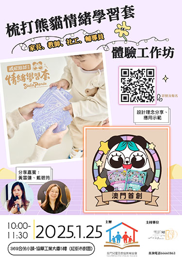 「梳打熊貓學院情緒學習套」體驗工作坊此次活動獲零距離合作社支持,將於2025年1月25日(星期六)10:00-11:30在369合伙小鎮(澳門提督馬路協華工業大廈5樓,紅街市對面)舉行,活動環節包括情緒學習套設計理念分享、應用示範及茶聚交流,免費參加,報名可填妥網上報名表:https://forms.gle/PizzvRFNnjxPGPS5A 。期待廣大家長、教師、社工及輔導員的踴躍參與,共同為孩子的美好未來助力,查詢可電66660863與 戴小姐聯繫。