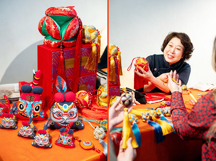 受此啟發,創作團隊在選材時進行了大膽嘗試,將仿宋系列的青花瓷圖案等巧妙融入繡球設計中。這種結合不僅展現了畫家思想與傳統技藝的碰撞,更讓產品煥發出獨特的傳統與手工技藝的魅力。為了與此次展覽更加契合,劉雲芳女士還精心製作了一系列小巧精緻的耳環、項鏈等飾品,並設 計了一系列以紅、黃、綠等中國傳統顏色為主調的產品,其中黃金顏色的設計尤為引人注目,寓意著祈福來年事事如意。