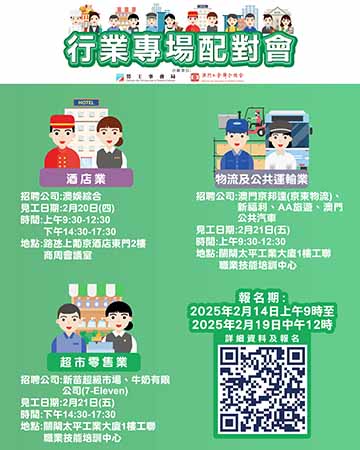 2月20日酒店業專場配對會在澳門上葡京二樓商周會議廳舉行;2月21日上午物流及公共運輸業專場配對會和下午超市零售業專場配對會在澳門工聯職業技能培訓中心(關閘馬路101-105A號太平工業大廈第一期1樓)舉行。報名日期為2月14日上午9時至2月19日中午12時。