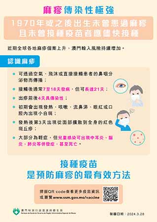 麻疹傳染性極高,未接種疫苗或未感染者很容易被傳染,而接種麻疹疫苗是預防感染、降低麻疹傳播風險的最有效方式。衛生局呼籲1970年或之後出生且未有麻疹免疫力的居民,前往流行地區前應確保已完成麻疹疫苗接種。居民可在一戶通(我的健康→健康紀錄→疫苗紀錄)查閱個人疫苗接種紀錄,也可向所屬衛生中心及衛生站查詢。