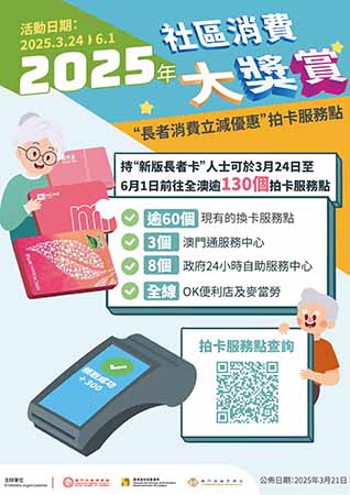 自今(24)日起至6月1日,長者可持新版“澳門通長者卡”到全澳逾130個指定服務地點,包括現有的60多個換卡服務點、3個澳門通服務中心、8個政府24小時自助服務中心以及指定便利店和商戶,拍卡領取總額300元的消費立減優惠。