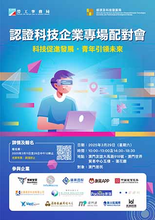 【特訊】為積極配合特區政府推動經濟適度多元發展策略,促進科技企業的業務擴展及成長,勞工局與經科局將於3月29日合辦“認證科技企業專場配對會”,旨在為認證科企招聘本澳人才。